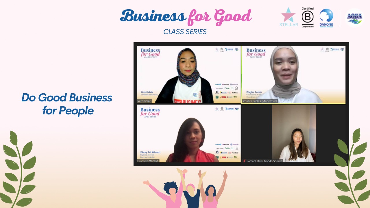 Program Business for Good Class Series merupakan program yang mengajak para pelaku usaha khususnya wanita berkumpul untuk saling berbagi pengalaman dalam mengembangkan bisnis yang berdampak secara ekonomi, serta memberikan manfaat berkelanjutan bagi lingkungan dan sosial termasuk pengenalan akan sertifikasi B Corporation bagi para pelaku bisnis.