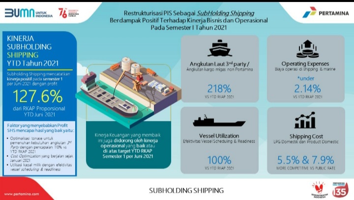 Pencapaian Laba Bersih sebesar 127,6 % dari YTD TW 2 RKAP 2021 juga selaras dengan target jangka panjang perusahaan untuk menjadi integrated marine logistics company. Restrukturisasi yang dilakukan oleh Pertamina dan Anak Perusahaan nya, sejauh ini memberikan dampak positif khususnya pada PIS sebagai Subholding Shipping. Dengan adanya organisasi yang lean dan agile PIS mampu fokus terhadap lini bisnis saat ini sehingga perusahaan dapat terus tumbuh sejalan dengan proses bisnis perusahaan untuk menjadi integrated marine logistics company.