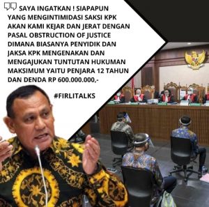 “Saya ingatkan kepada siapapun (yang mengintimidasi saksi KPK), kami kejar dan jerat dengan pasal obstruction of justice, dengan tuntutan hukuman maksimum penjara 12 tahun dengan Rp 600.000.000,” kata Firli Bahuri dalam keterangan resminya hari ini, Senin (24/8/2020).