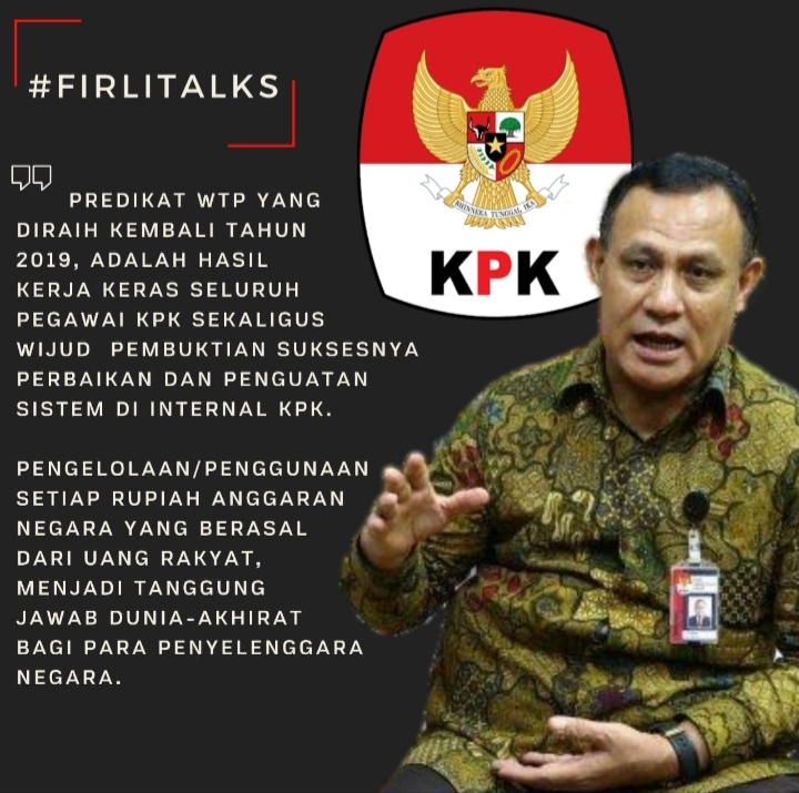 “Selain itu, predikat WTP yang dapat kami raih kembali di 2019 setelah tahun sebelumnya (2018) hanya diganjar opini Wajar Dengan Pengecualian (WDP) oleh BPK adalah wujud pembuktian suksesnya perbaikan dan penguatan sistem di internal KPK, yang senantiasa merespons dan memperbaiki diri terhadap kelemahan-kelemahan yang ada sebelumnya,” kata Firli.