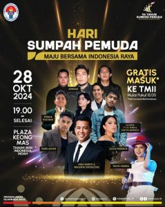 Kanalnews.co, JAKARTA- Kementerian Pemuda dan Olahraga (Kemenpora) akan merayakan Hari Sumpah Pemuda ke-96 dengan sejumlah kegiatan di Plaza Keong Mas, Taman Mini Indonesia Indah, Jakarta pada Senin (28/10). Sejumlah bintang tamu bakal turut meramaikan.