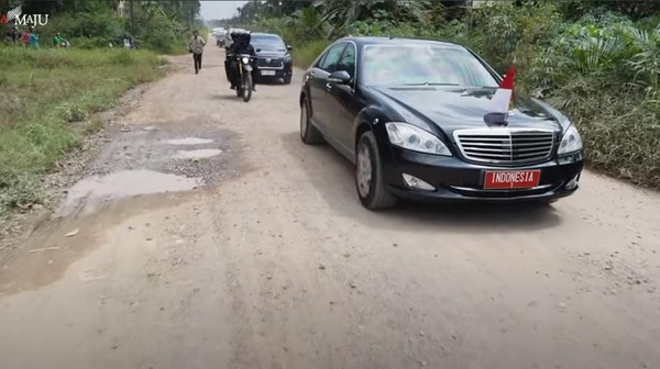 Jokowi mengecek jalan rusak di ruas Kota Jambi-Sungai Gelam, Muaro Jambi, dengan menumpang mobil sedan berpelat ‘Indonesia 1’. Jokowi didampingi Menteri PUPR Basuki Hadimuljono hingga Gubernur Jambi Al Haris.