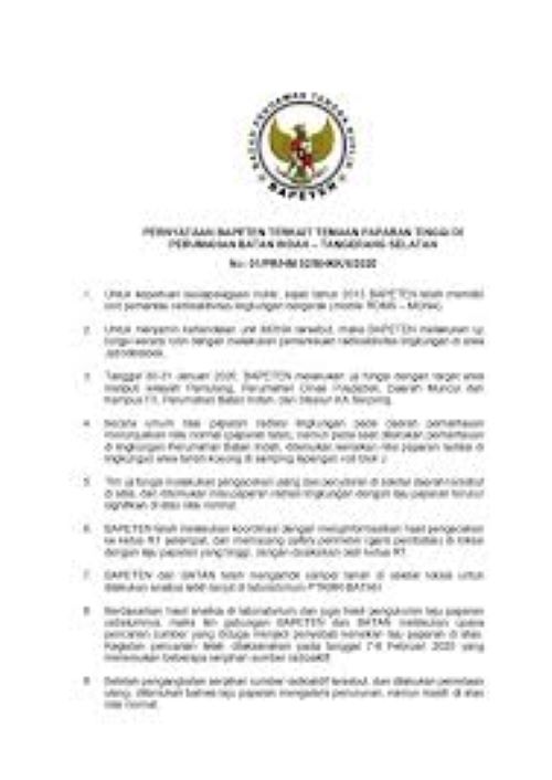 Dalam keterangan tertulis BAPETAN, Jumat (14/2) menjelaskan terkait ditemukannya Paparan Tinggi di perumhan Batan Indah, Tangerang Selatan, menyatakan, untuk menjamin kehandalan unit MONA tersebut, maka BAPETEN melakukan uji fungsi secara rutin dengan melakukan pemantauan radioaktivitas lingkungan di area Jabodetabek.