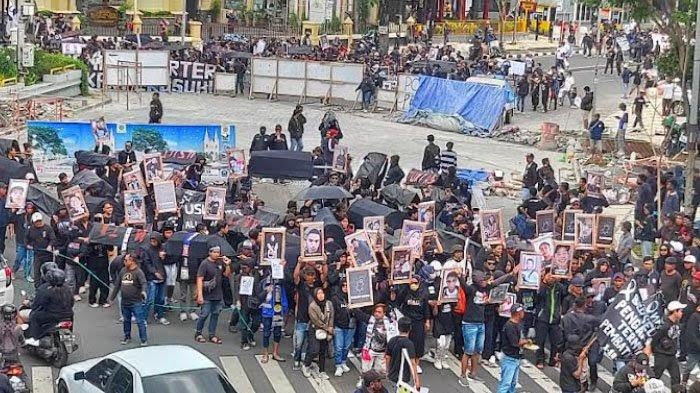 Tak hanya keranda, aksi peringatan 40 hari tragedi Kanjuruhan juga dipenuhi berbagai spanduk dan tulisan dan foto-foto.