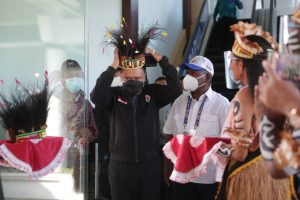 Menko PMK dan Menpora dipersilakan menggunakan topi khas Papua. Setelah itu, Menpora dan Menko PMK memasuki ruangan VVIP yang juga sudah disambut oleh beberapa pejabat daerah Papua.
