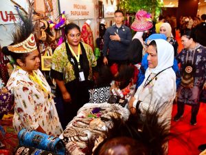 Dalam kegiatan yang juga melibatkan pelaku UMKM dari 6 provinsi di daerah Papua ini, Ibu Iriana beserta anggota OASE KIM melihat berbagai produk hasil kriya pelaku UMKM seperti tas, aksesoris, hingga kerajinan yang terbuat dari rotan. Ibu Iriana dan Ibu Wury dalam kesempatan tersebut mengapresiasi karya perajin Papua.