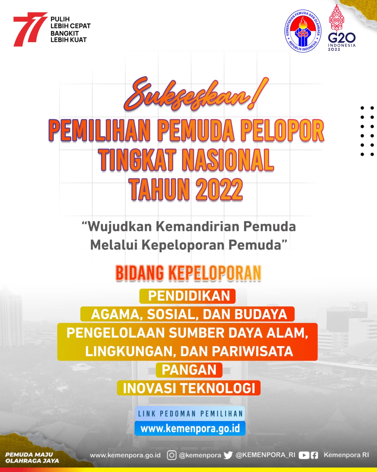 Pemilihan Pemuda Pelopor Tingkat Nasional merupakan ajang tahunan yang digelar Kemenpora RI yang puncaknya akan dilakukan pada peringatan Hari Sumpah Pemuda, 28 Oktober 2022. Pemilihan ini menjaring pemuda dari seluruh Indonesia, yang tahapan penjurian dan seleksinya dilakukan secara berjenjang dimulai dari tingkat Kabupaten/Kota, tingkat Provinsi hingga ke tingkat Nasional.