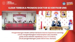 Adapun mahasiswa yang diuji selaku promovendus pada kesempatan ini adalah Sulistiyono, dengan judul penelitian “Pengembangan Model Latihan Berbasis Games Experience Learning untuk Mengembangkan Keterampilan dan Karakter pada Siswa Sekolah Sepakbola Kelompok Umur 9 – 12 tahun (Studi Pada Sekolah Sepakbola di Kabupaten Sleman, Yogyakarta).