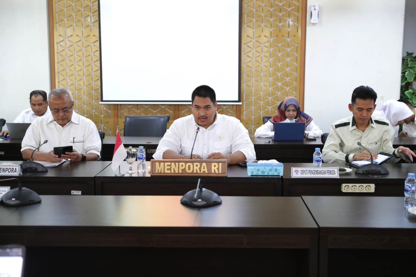 Menpora Dito didampingi Sesmenpora Gunawan Suswantoro di ruang sidang lantai 3 Kantor Kemenpora Senayan, Jakarta, Senin (4/9/2023). Rapat tersebut diikuti para Pejabat Eselon I,II, para Staf Khusus, para Tenaga Ahli serta diikuti juga Event Organizer (EO) untuk Rakornas dan Event Organizer untuk Haornas yang mengangkat tema ‘Gelanggang Semangat Pemenang’.
